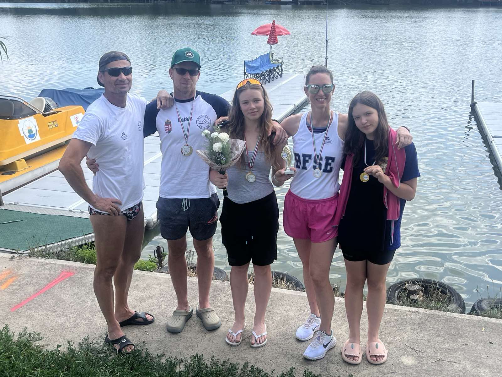 Az év egyetlen nyílt vízi országos versenye a Tisza holtágnál. Pazar környezet, csábító víztükör. A napkorong úgy szórja Noémire a fényt, mint Mátyás a rekordokat. De akkor mit mondjunk Balázsról? Semmit. Viszont a legfiatalabb Szenior (Szonja) elhozta az abszolút első helyet. Mátyás pedig a feleségét. A lesőharcsák nem izgatták magukat a nagy lármától és csapkodástól. Még akkor sem emelték ki fejüket az iszapból amikor Dalma átsiklott fölöttük. Mindig nagy élmény a stégen ülve "Hajrá Drágám"-ozni a gyönyörű napsütésben, drukkolni az olimpikonnak, élvezni a nyarat, a vizet, az úszást és az együttlét örömét.